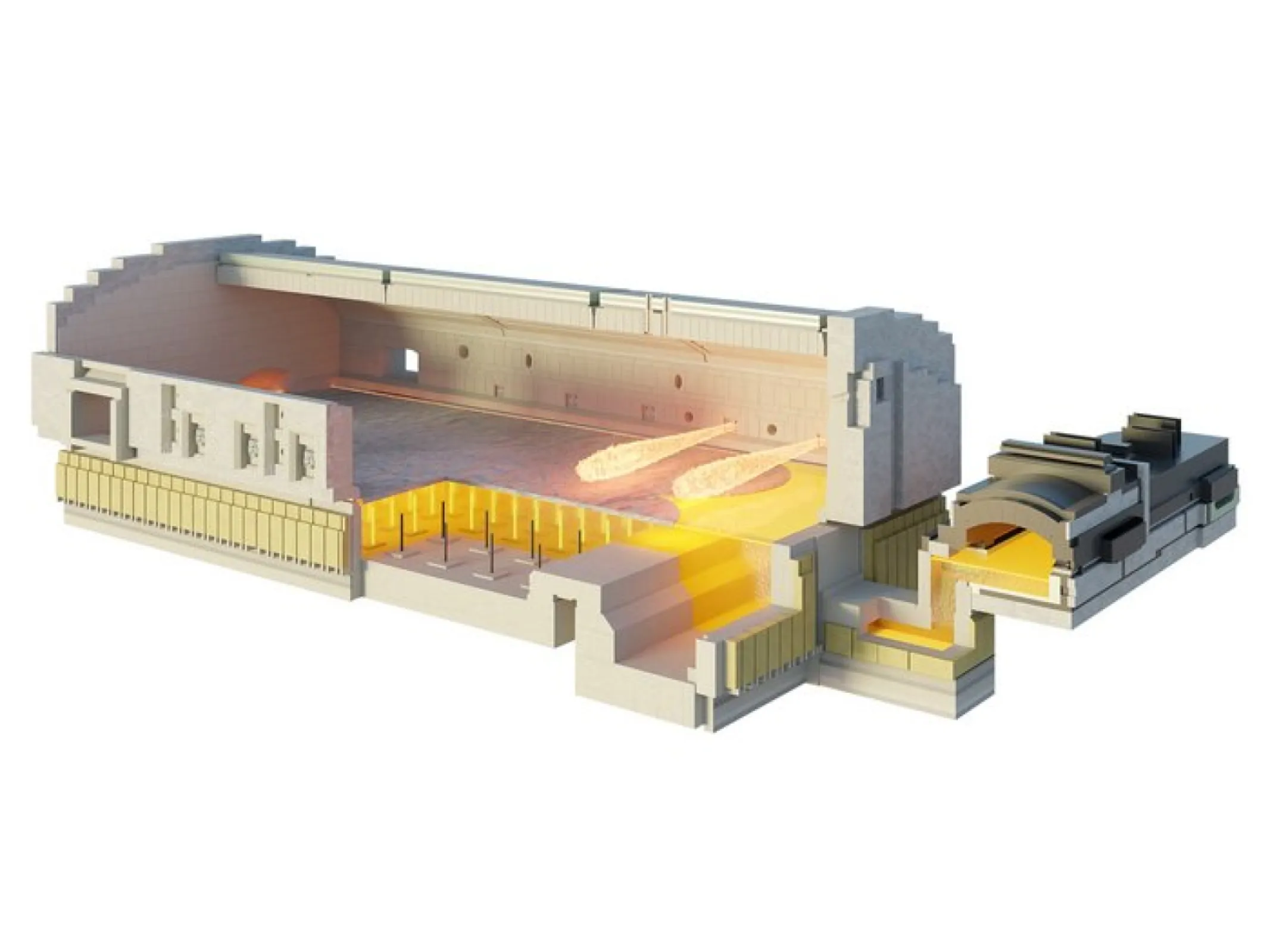 HORN hybrid furnaces are specially designed to combine the classic heating method of combusting a fossil fuel with the usage of more electric power by using electrodes in the melting tank. The high electric share leads to a reduction of the fuel consumption and therefore to lower temperatures in the superstructure. In combination with a lower flue gas volume (even more for an oxyfuel furnace), this requires a modification of the superstructure design and possibly of the refractory materials to avoid cold spots and the subsequent damage.